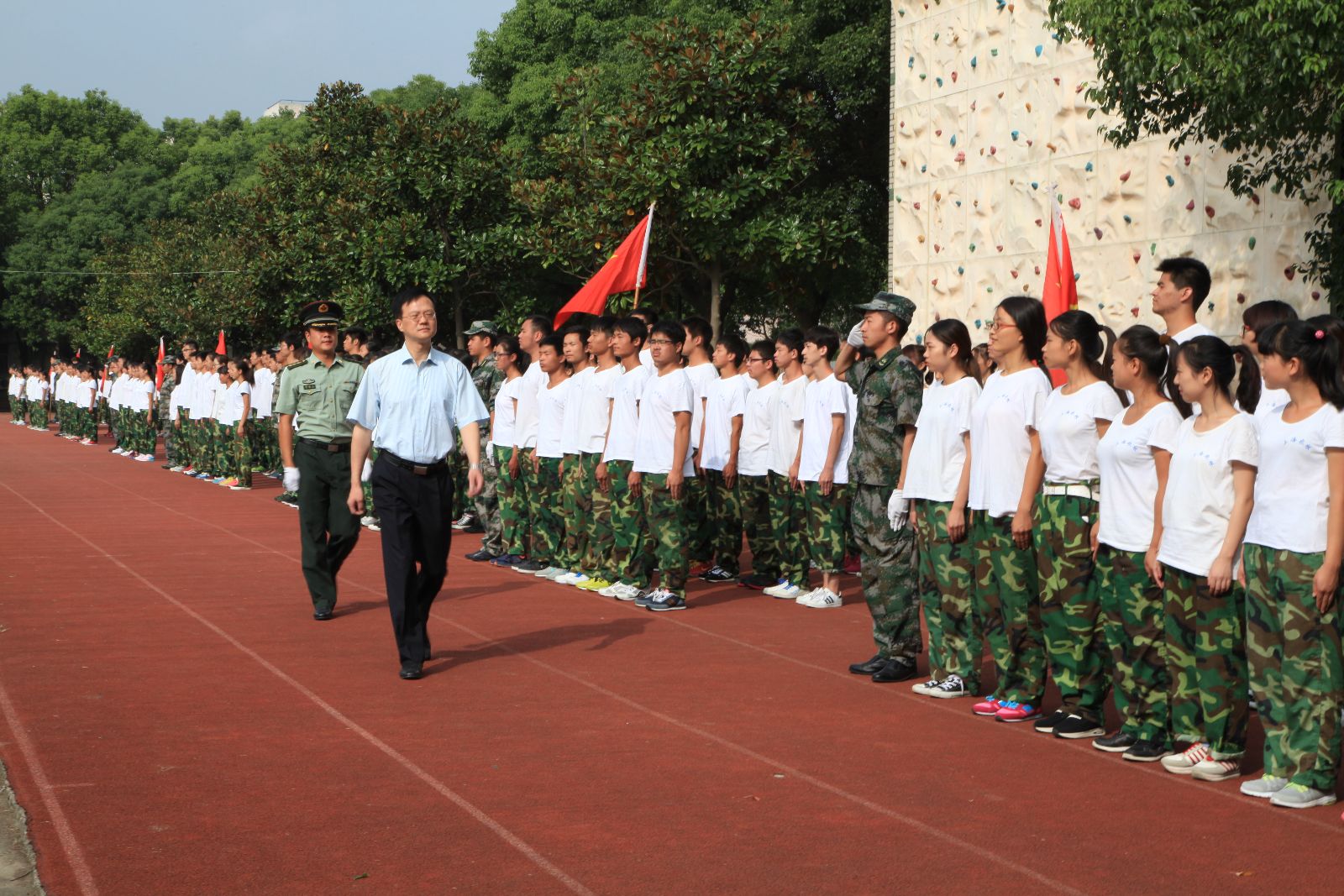 在倪南飞的陪同下,魏华院长检阅了军训方队,同学们精神抖擞,气势高涨,一声声“为校争光”响彻训练场上空。分列式上,三十一个军训方队在军训团团旗的引导下依次走过主席台。同学们整齐的步伐,嘹亮的口号,展现了新上农人健康向上、积极进取的精神风貌。接下来,进行了会操汇报表演。五个连队的参训学生士气高昂,口号响亮,步伐雄壮,动作精准,展示了丰硕的军训成果。
