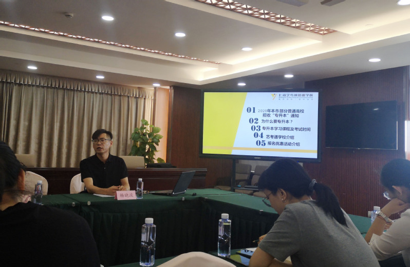 继续教育中心邀请上海艺考通培训学校杨晓波老师为辅导员介绍专升本相关问题。杨老师剖析了不同形式专升本的社会认可度,针对学院不同的专业类别分析了专升本志愿填报方向,并围绕专升本的优势、近年来的招考形势和报考的基本流程等问题进行了讲解。