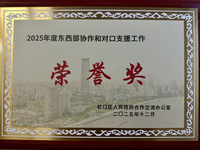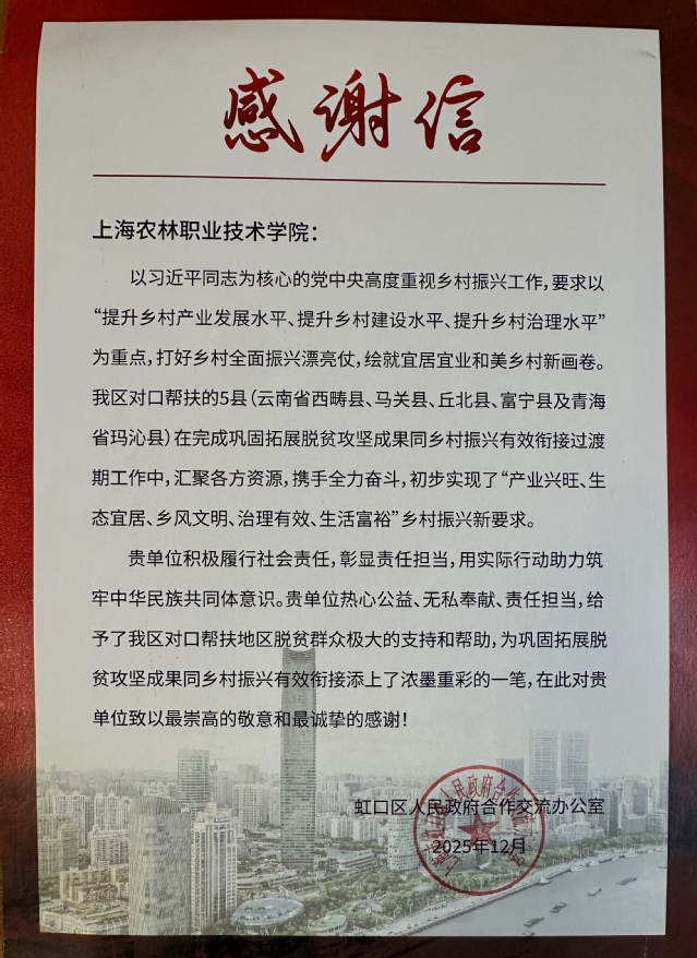 此次荣誉奖牌和感谢信由虹口区人民政府合作交流办公室颁发,是对学院长期深耕对口支援工作、服务国家战略的充分肯定。学院将以此为新的起点,继续在乡村振兴的广阔舞台上担当作为、奋勇前行。